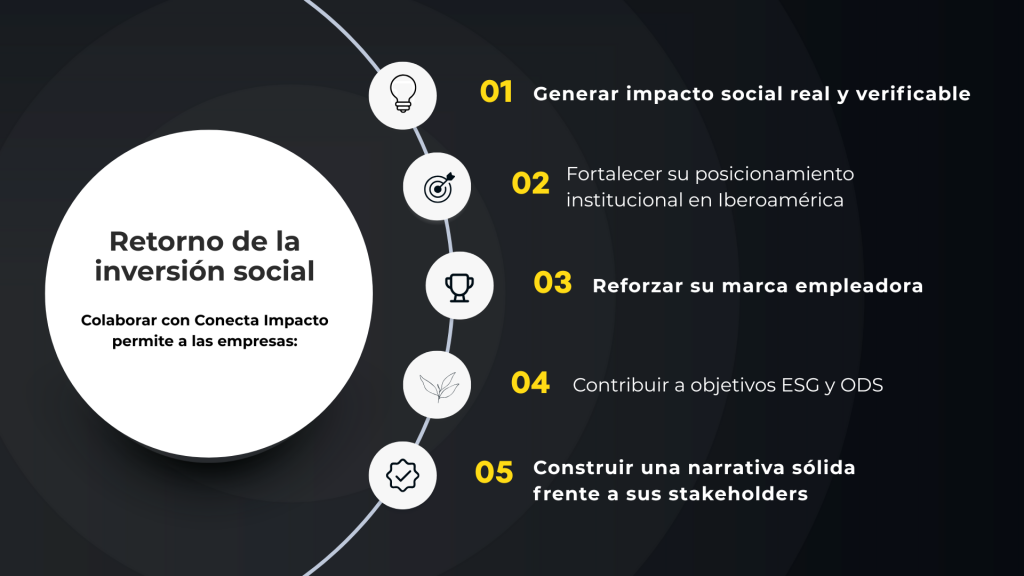 Conecta Impacto, es la vertical de Conecta Iberoamérica dedicada al diseño y ejecución de programas de responsabilidad social corporativa (RSC) e impacto social para empresas con presencia en Iberoamérica.